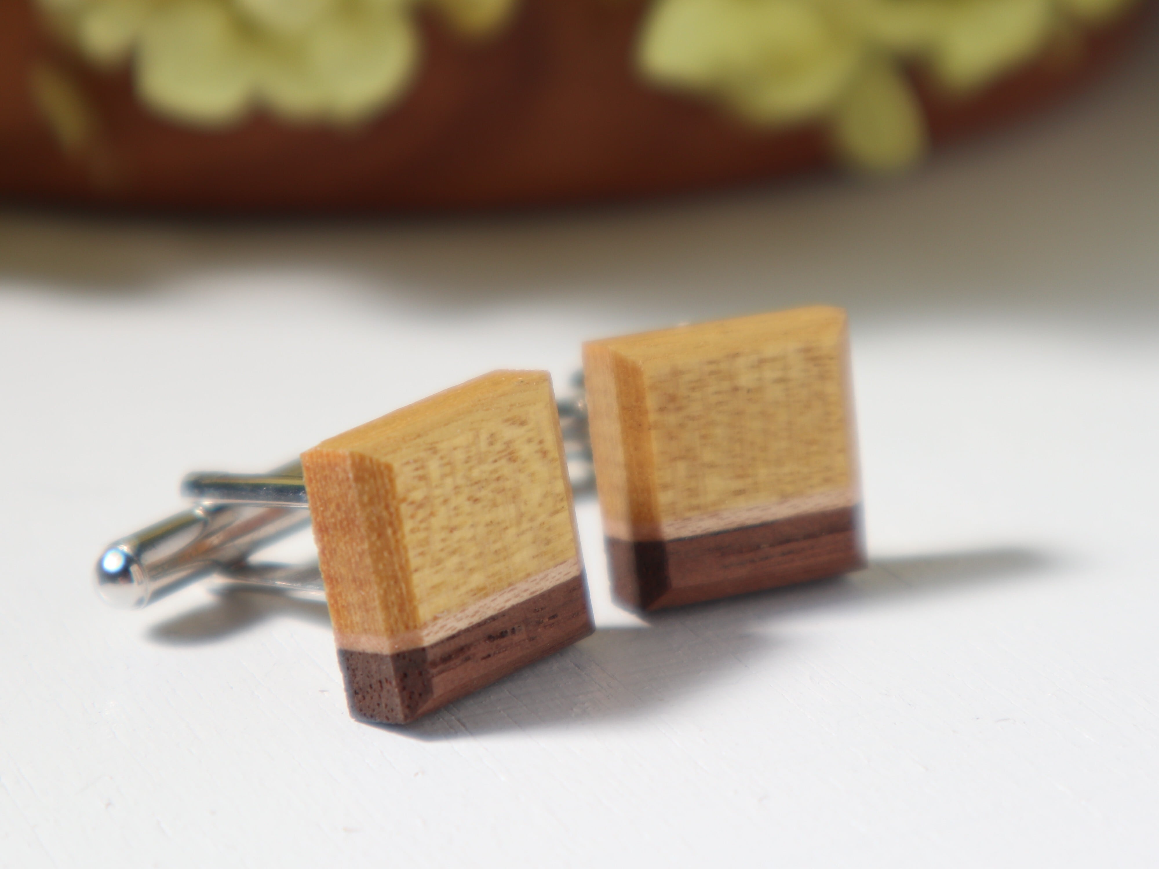 無着色の無垢の木を組み合わせた木製カフスボタンです。